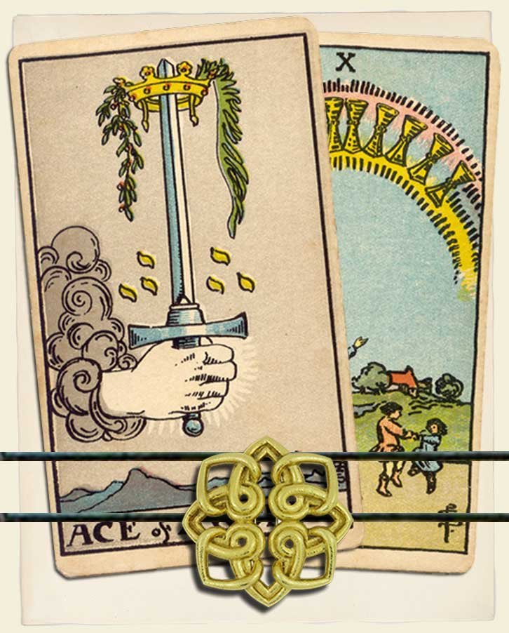 Ace of swords and Ten of cups combination provides an insight into a major event in your future, which is influenced by the arcane forces of (1) NEW IDEA and (2) DIVINE LOVE. You’re so close, but you still don’t know what step to take. Sometimes what you need to do is right under your nose, but you can’t see what’s in front of you. If you turn inward, even you will be surprised at what life will give you. Love, pray, and be thankful… this is necessary to heal your wounds.