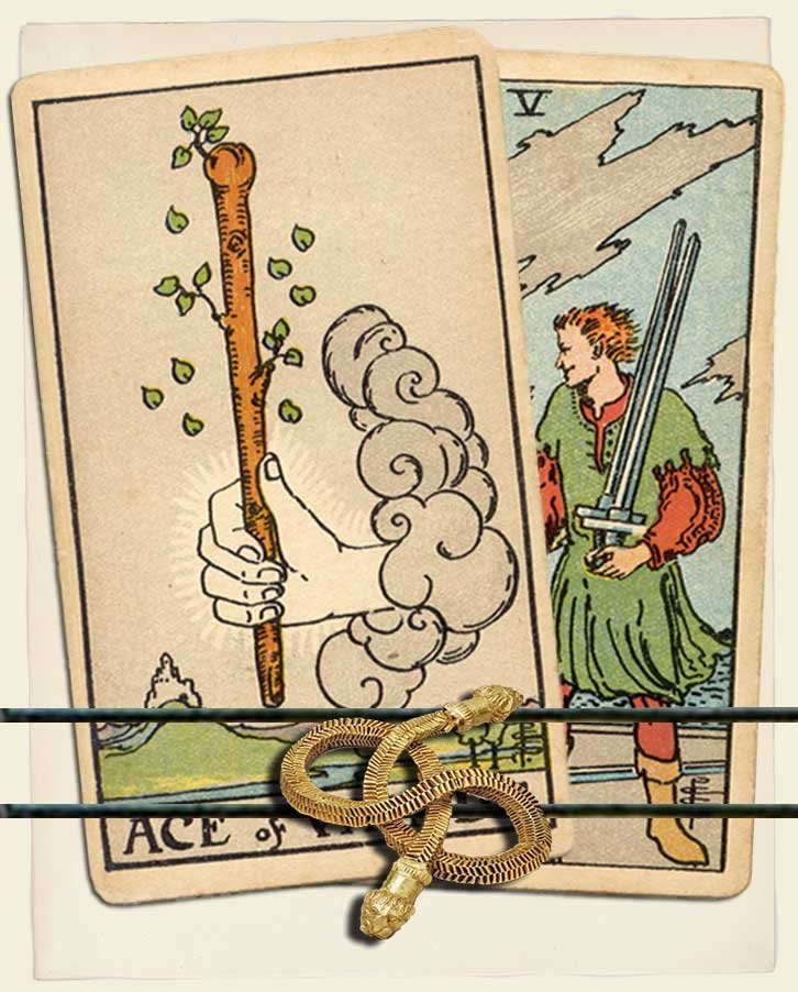 My dear friends, when we speak of the Ace of Wands and Five of Swords in relation to love and relationships, it is important to understand that this combination represents both new beginnings filled with passion and heated arguments that test our boundaries. It is a sign from the mystic tarot forces that govern our life decisions today.