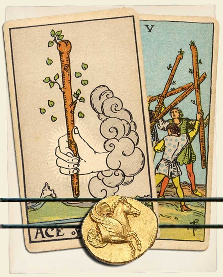 When it comes to love and relationships, the Ace of wands and Five of wands combination may not be the most positive sign. However, this tarot reading does give a glimpse into the medium-term future with regards to two important forces: inspiration and aggression.