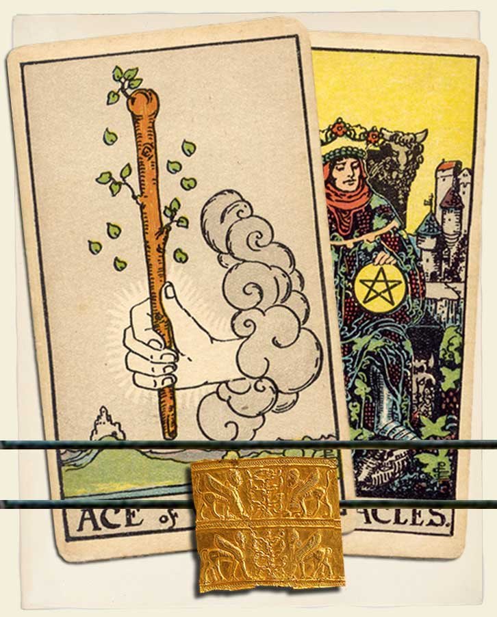 Ace of wands and King of pentacles combination means that two tarot influences: (1) Potential and (2) Abundance (arcane influence by King of pentacles) have influence on you today. What’s the advice of this pair? The Ace of wands represents a passionate new beginning that will create something powerful. This energy can be overwhelming, though. It is important to keep things in perspective when it appears with the King of pentacles – there is plenty to go around, so don’t burn any bridges or take advantage of people who are generous out-of-context. Be sure to follow through on your intentions and build upon what you start rather than letting it fizzle away.