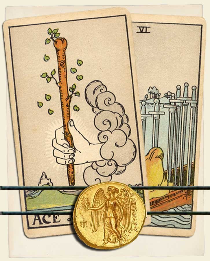 Ace of wands and Six of swords combination gives you a hint about a major event in your future, which will arise from the combined effect of: (I) ENTHUSIASM (effect of Ace of wands) and (II) DISTANCE (effect of Six of swords). What’s the advice of this pair? The Ace of wands represents an enthusiastic new beginning. This energy can be so powerful that it creates its own weather conditions – sometimes too much for comfort. In such cases, distance is indicated to temper the enthusiasm. The Sixes represent moving away from something we have invested heavily in. If you are starting a new project or relationship, consider taking some time off to evaluate how things are going before jumping into another hot-button issue with both feet.