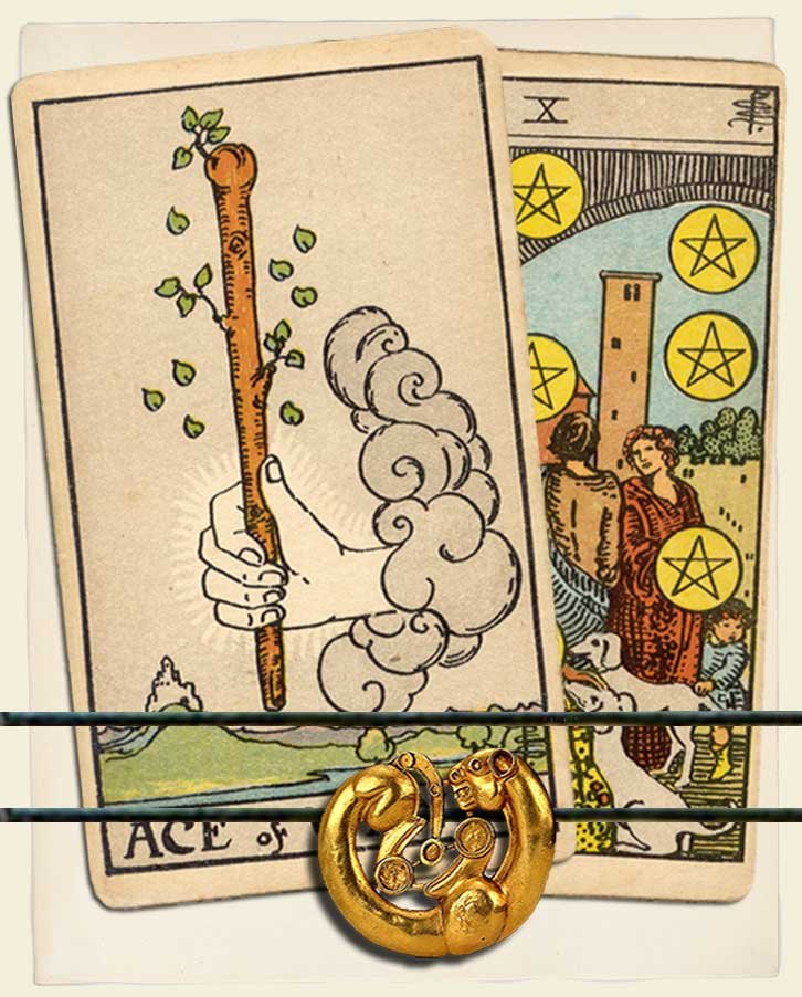 Ace of wands and Ten of pentacles combination means that tarot influences: 1) Potential and 2) Family govern your life decisions today. To put it differently, it indicates that you may get together with important people in your life at this time because of a passion you share for a new project. The Ace of Wands brings you a powerful sense that what you could only just imagine before is possible now, when you get together with the people closest to you. It could be your family, lifelong friends, or maybe even a lover, if he or she is in a serious relationship with you, but through them, you will find the motivation to start an exciting new adventure.