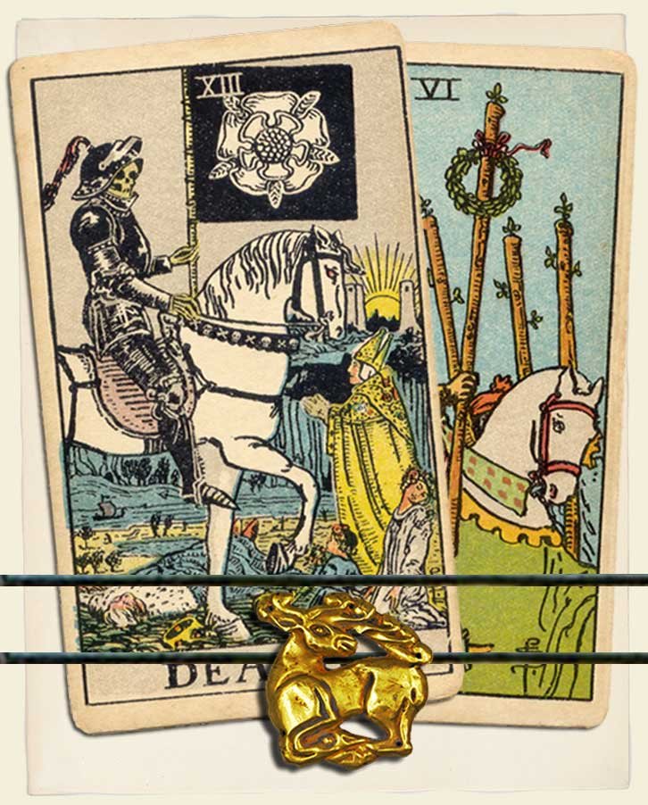 Death and Six of wands combination is an omen that mystic tarot forces: A) Letting Go (Death) and B) Rewards (Six of wands influence) currently guide your decisions. What does this card combination mean for you in practice? In other words, it means your release of the current toxins in your life will create a world of possibility in your future. Continue taking the final steps to say goodbye to that which belongs in the past, and the Universe will reward you with blessings in the future. Physically practice de-cluttering items in your life right now to mirror your deeper actions.
