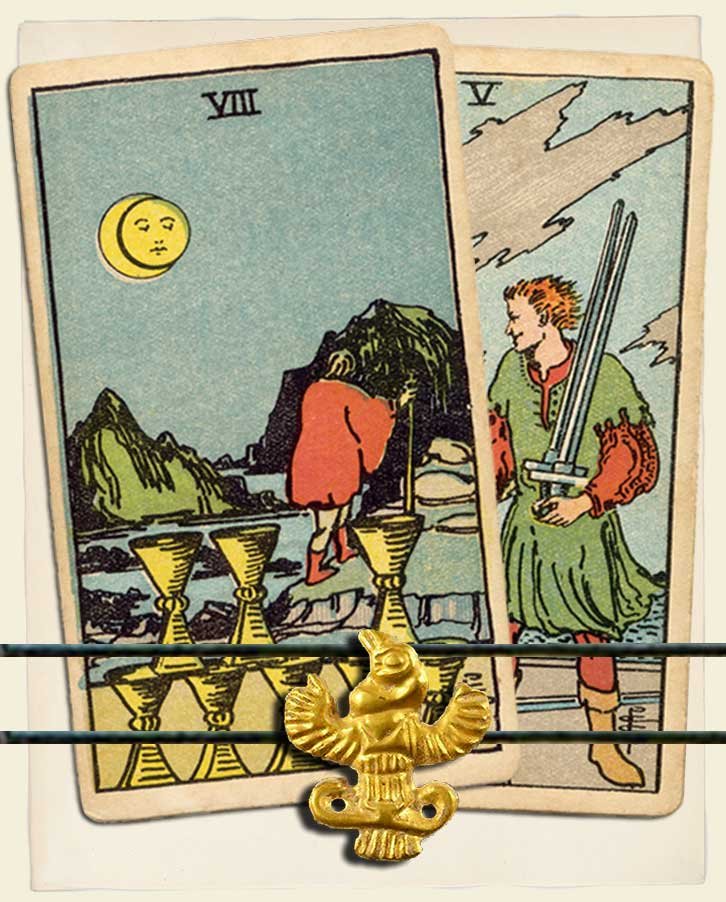 Eight of cups and Five of swords tarot combination gives you a divination about your medium-term future. It is influenced by the arcane forces of (A) Abandonment and (B) Aggression. What does it mean? The Eight of Cups is often seen as an echo of The Hermit from the major arcana with them both sharing the message of turning inward and away from a situation. When combined with the Five of Swords, it suggests that you should be aware of when you have a desire to win at any cost, and that this may not be the correct path for you. Try to take a moment to think about what it is that you want, and whether the actions that you take to get it are justified.