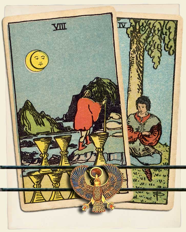Eight of cups and Four of cups combination means that two forces: 1) Abandonment (from the side of Eight of cups) and 2) Contemplation (from the side of Four of cups) have influence on you at this moment. So many cups! This may mean that a strain with a romantic partner has left you both feeling half-empty. Reflecting on your own feelings before taking action can help avoid big blowups. Be aware of what you say and how you say it, right now, you can come off defensive. Show empathy towards each other moving forward. Abundance is achievable when forces combine.