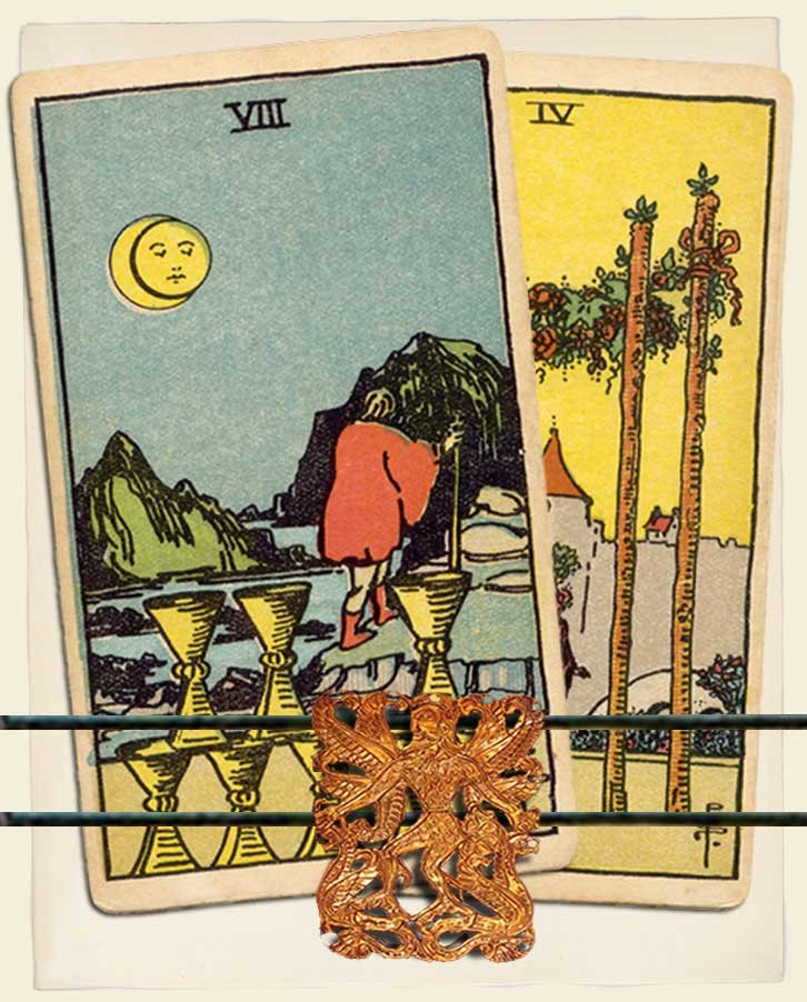 Eight of cups and Four of wands tarot combination means that two mystic forces: I) Disappointment (Eight of cups) and II) Community (Four of wands) are at play today. When this pair appears you can expect to lose some sort of followers or supporters currently or soon. The community or followers may feel a sense of disappointment from you and are deciding to branch off or veer in a different direction. They may treat it as a celebration of some sort.