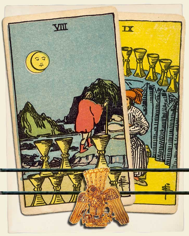 Eight of cups and Nine of cups combination indicates that two arcane dynamics: 1) Walking Away (influence of Eight of cups) and 2) Success (influence of Nine of cups) guide your decisions today. Most tarot readers would consider this a turning point in your self-awareness. After all you have experienced, you are left with one question: am I content? Considering the transition from eight cups to nine, the traveler is wise enough to look for more. Despite how content they already felt, life was becoming stagnant. With gratitude for all the cups he already had, the traveler knowingly stepped away to find his next cup. So, now is the time to ask yourself: how will you fill your next cup?