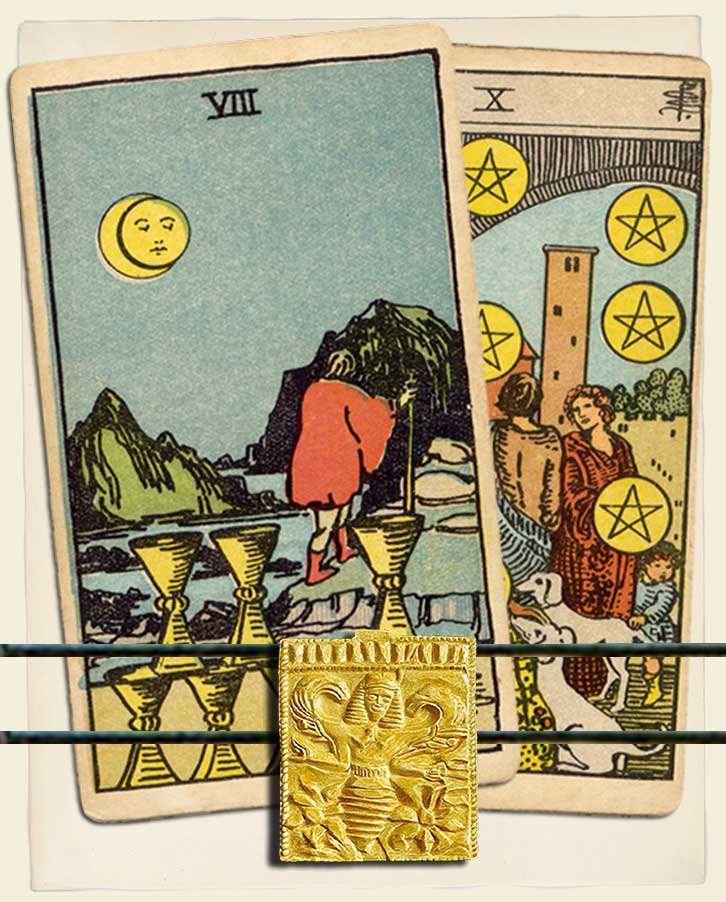 Eight of cups and Ten of pentacles tarot combination is a sign that two tarot influences: 1) ESCAPISM and 2) LONG-TERM SUCCESS together are exerting influence on you. To put it differently, it means a project which has the opportunity to produce long-term financial or emotional fulfilment has become utterly taxing, and you are doubting whether you should continue or simply abandon the venture altogether. This is not the time to give up. The Ten of Pentacles promises this is a worthwhile venture which will not only provide for you but also those around you, laying the groundwork for an existence of harmony and freedom. Even if the steps forward are small and infrequent, keep your eyes ahead and continue walking.