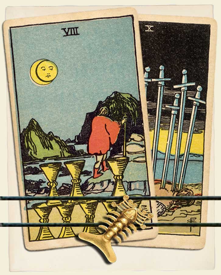 Oh, dear. It seems like we have a bit of a tough situation here when it comes to love and relationships with the Eight of cups and Ten of swords combination. Mystic tarot forces are indicating that we are being influenced by two things: letting go and bitterness.