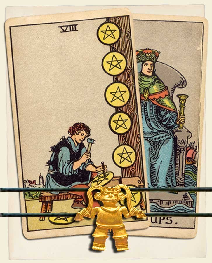 Eight of pentacles and King of cups tarot combination gives an insight into a significant event in your future, which is influenced by the arcane forces of (A) expertise and (B) counsellor. In essence you will feel an immense emotion of fulfilment if you help someone in need. Someone in your circle is in need of help specifically from you. Why? This is because their problem could be resolved in a much faster and better way using your expertise. You have what it takes to solve their problem better than they can solve their problem alone. Whether it is your knowledge, your patience or your technological skills, but after having helped them resolve their problem, a sensation of joy and accomplishment awaits you.