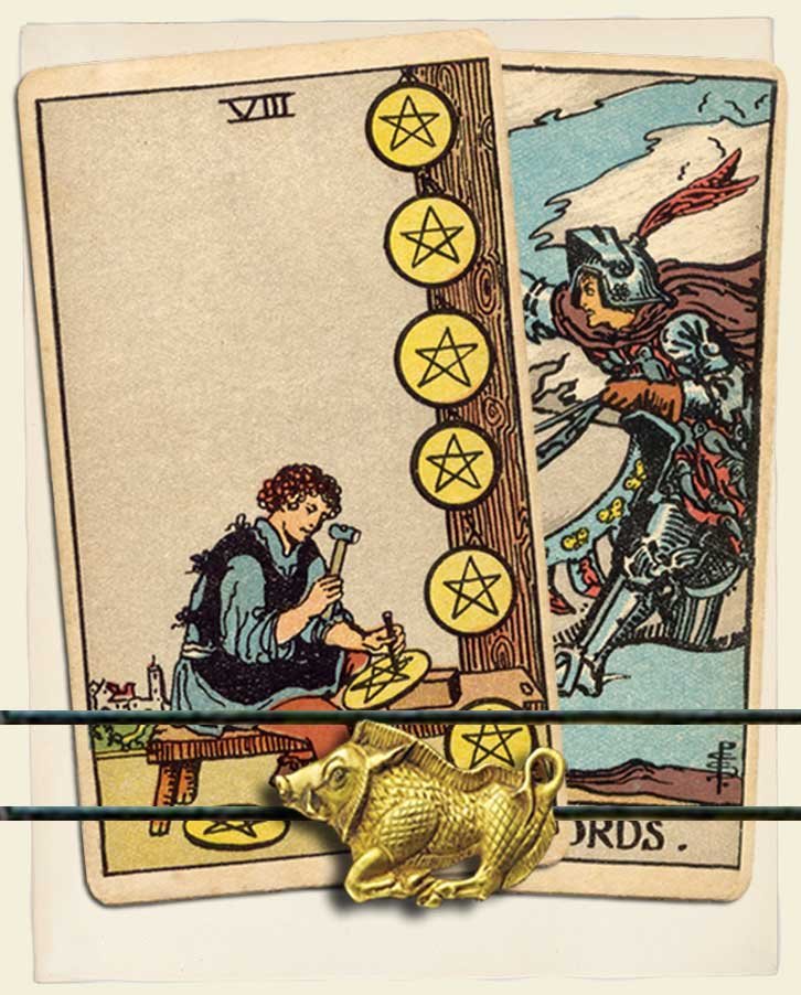 Eight of pentacles and Knight of swords tarot combination gives a clearer perception about your near future, which will come to pass from the combined effect of (1) CRAFTSMANSHIP (effect of Eight of pentacles) and (2) ASSERTIVE (effect of Knight of swords). You work miracles with your hands. People admire what you do and ask how you became so skillful. It is like a fairy girl kissed your hands as she passed through heaven and now you are making everything you touch beautiful in the world. Soon you will have a job to overcome, you can easily overcome this job if you are confident in your abilities.