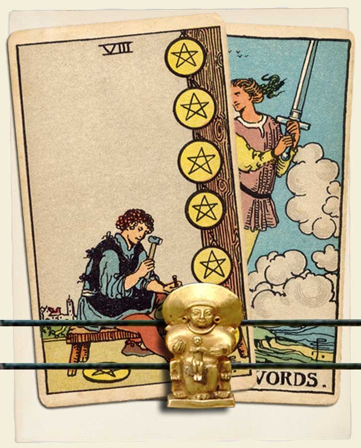 Eight of pentacles and Page of swords combination means that two forces: 1) Apprenticeship and 2) New Ideas govern your life decisions today. The Eight of Pentacles is the card of the apprentice, and it indicates that you are in a period where you will have to learn new skills or tasks. Pages from the sword represent communication, so when combined with this card, it may be time for you to speak up about an important issue in your life. This could lead to conflict if others don’t agree with what you think needs changing, but at least now they know how you feel. Try not to take things too personally here.