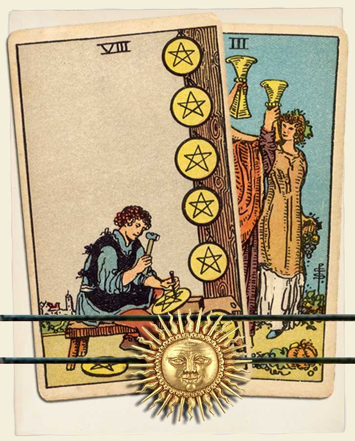 Greetings, dear one. You seek the wisdom of our tribe on matters of love and relationships. The tarot cards have spoken to you through the combination of Eight of Pentacles and Three of Cups.