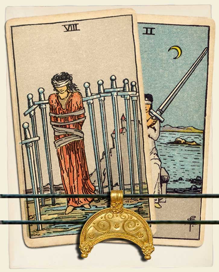 Hey there, love birds! Today we are talking about the Eight of swords and Two of swords combination in relation to love and relationships. This is not a great sign, folks. These cards suggest that you are feeling paralyzed and stuck in an impasse when it comes to your romantic choices.