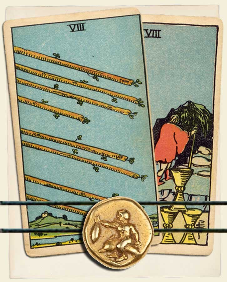 Eight of wands and Eight of cups tarot combination gives you a better insight into your distant and barely discernible future, which is influenced by the arcane forces of (A) Alignment and (B) Abandonment. Most tarot readers would consider this a sad portent, but the abandonment will not be your love interest or employment prospects. What is destined to leave your life is a bad habit you have not yet managed to kick. You will soon find yourself feeling closer to the energy of your Higher Power, which will give you the strength to embrace better habits.