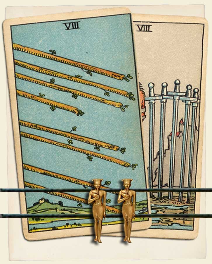 Well now, let me tell you something about the Eight of Wands and the Eight of Swords combination in relation to love and relationships. It’s not looking too good my friend. You see, there are two forces at play here: Quick Decisions and Powerlessness. If you act rashly today, you’ll just be a victim to the cycle of life around you.