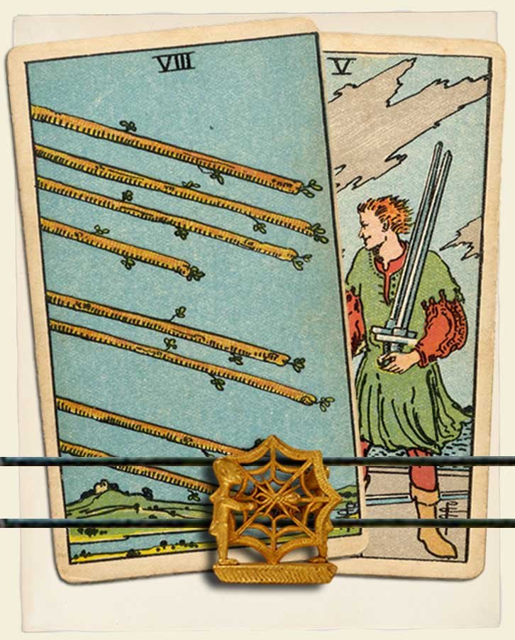 Eight of wands and Five of swords combination is a sign that two mystic forces: 1) Quick Decisions (from the side of Eight of wands) and 2) Disputes (from the side of Five of swords) have influence on you today. You may be in a rush to make important choices, but it seems like everyone else is moving at light speed compared to you right now. Slow down. It isn’t just your friends who are having trouble keeping up with your pace. Everyone around you has their own reasons for being frustrated, so don’t take it out on them or yourself. Take time to think about what direction you want this situation or any future situations involving you to go in to reach an agreement.