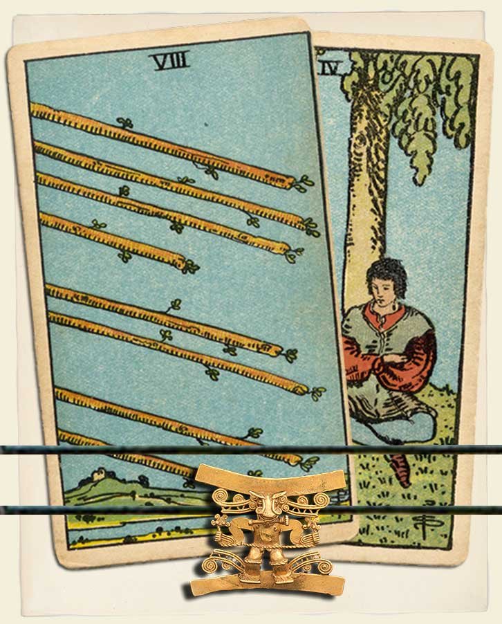 Well, darling, it seems that the Eight of Wands and Four of Cups combination is not quite what one would hope for in matters of the heart. According to these cards, your medium-term future will be shaped by a mix of alignment and melancholy – not exactly the most romantic pairing.