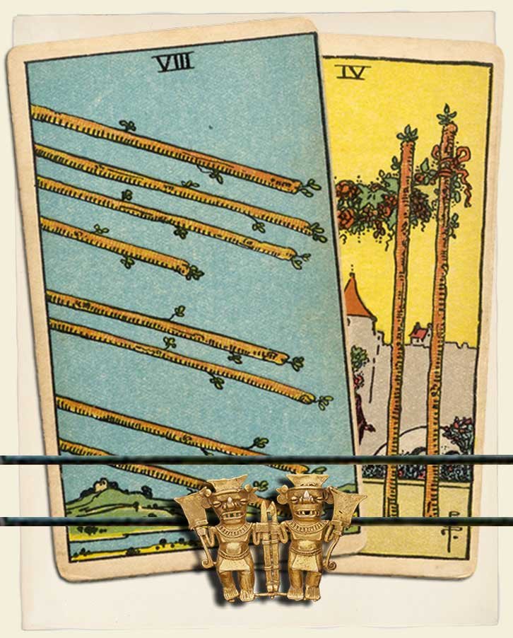Eight of wands and Four of wands combination provides an insight into a major event in your future, which is directed by the guiding influences of (A) PROGRESS and (B) REUNIONS (as per influence of Four of wands). There is a rush in the air as you make plans with people you care about to get together and dance and sing or maybe build a 5 foot tall playing card mansion that you could knock over as soon as you get it erected. You know. Where you just kind of do things for fun because you know you are hanging out with people you like, and it doesn‘t really matter what you do when you are with the people you love. It is going to be fun, even if you burn the pizza and forget the beer.