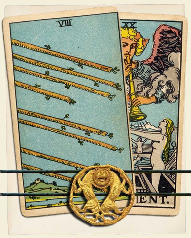 Eight of wands and Judgement combination gives you a better insight into your medium-term future, which will come to pass from the combined effect of (1) Action (effect of Eight of wands) and (2) Reflection (effect of Judgement). What does this card combination mean for you in practice? The Eight of wands represents rapid forward movement that often involves plenty of communication. This card indicates that you may be very busy soon and will have a lot of places to be and people to meet. Judgement represents a deeply profound self-reflection that allows you to get in touch with your true self. It is a highly personal experience that often requires solitude. The busyness of your life makes this difficult. Getting past Judgement puts you in a place to close out a major cycle in your life, so take the time to make the effort to do this work on yourself.