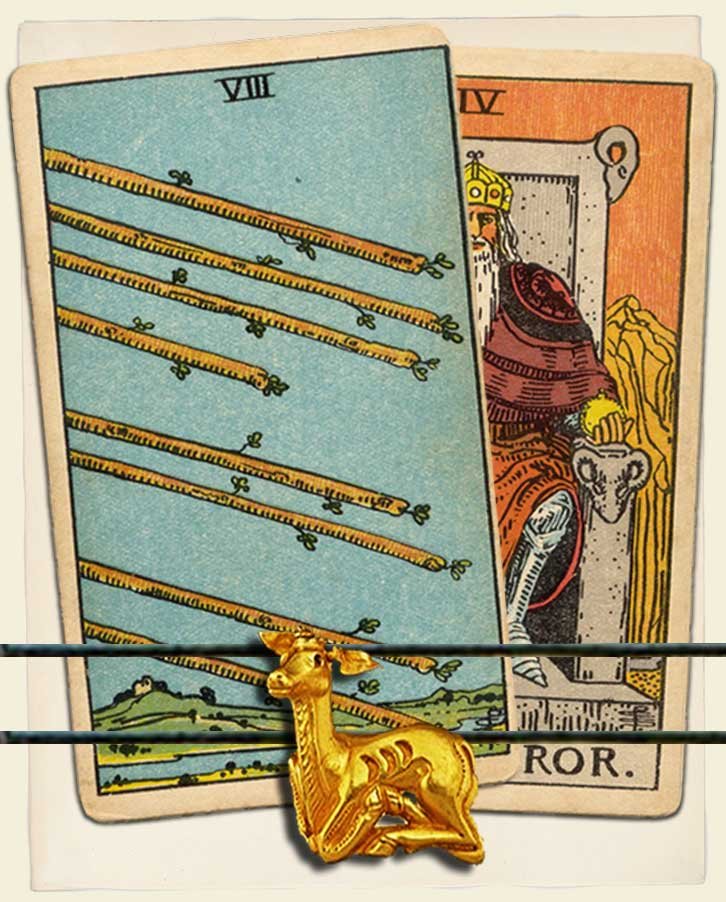 Eight of wands and The Emperor combination gives an insight into your near future. It will come to pass from the combined effect of (1) PROGRESS (effect of Eight of wands) and (2) AUTHORITY (effect of The Emperor). To put it differently, it indicates the kind of authority that knows no boundaries. It doesn‘t need to when you find the Eight of Wands with the Emperor. All lights are green. Love, business and sports are all favored now with the wind at your back. It is almost as if you are on the wings of bird as you face your friends, family and detractors like a master of your own destiny. You are. Go for it.