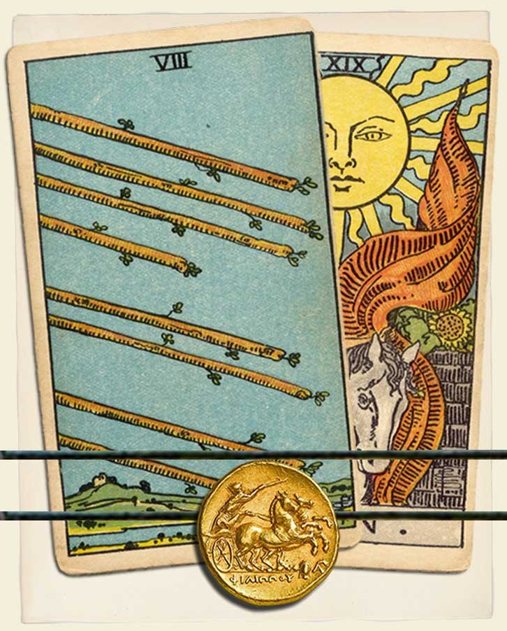 My dear child, the Eight of wands and The Sun tarot combination is a sign that you will have a clearer perception about your medium-term future in love and relationships. You must remember to align your energy with those around you, for what may seem fun to you could be hurtful to others. Be careful how you use your words and actions.