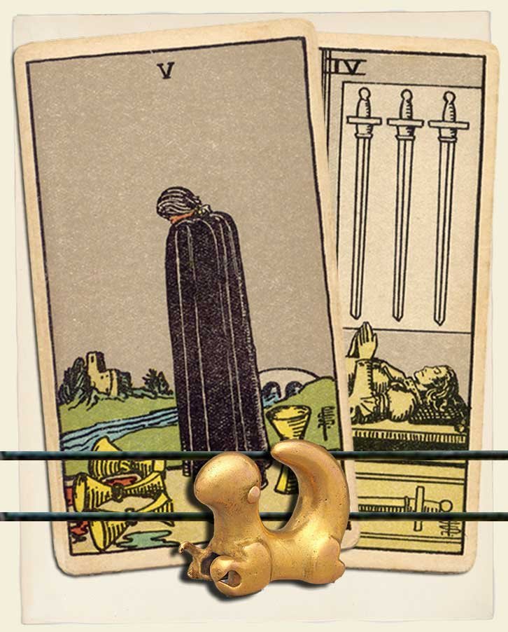 Five of cups and Four of swords together means that two tarot influences: A) Regret (Five of cups) and B) Rest (Four of swords) are jointly affecting you today as you hide from your feelings, and who could blame you? They are pretty rough at the moment. It seems you may have suffered a recent loss or ended an important friendship for reasons beyond your control. Your heart is broken, and this feeling may color everything around you. You may ignore the dog or snap at your own best friend for no reason, so maybe it is time to retreat and regroup. Rest and relax. This feeling will not last forever, so let it pass. You will come back feeling better about it.