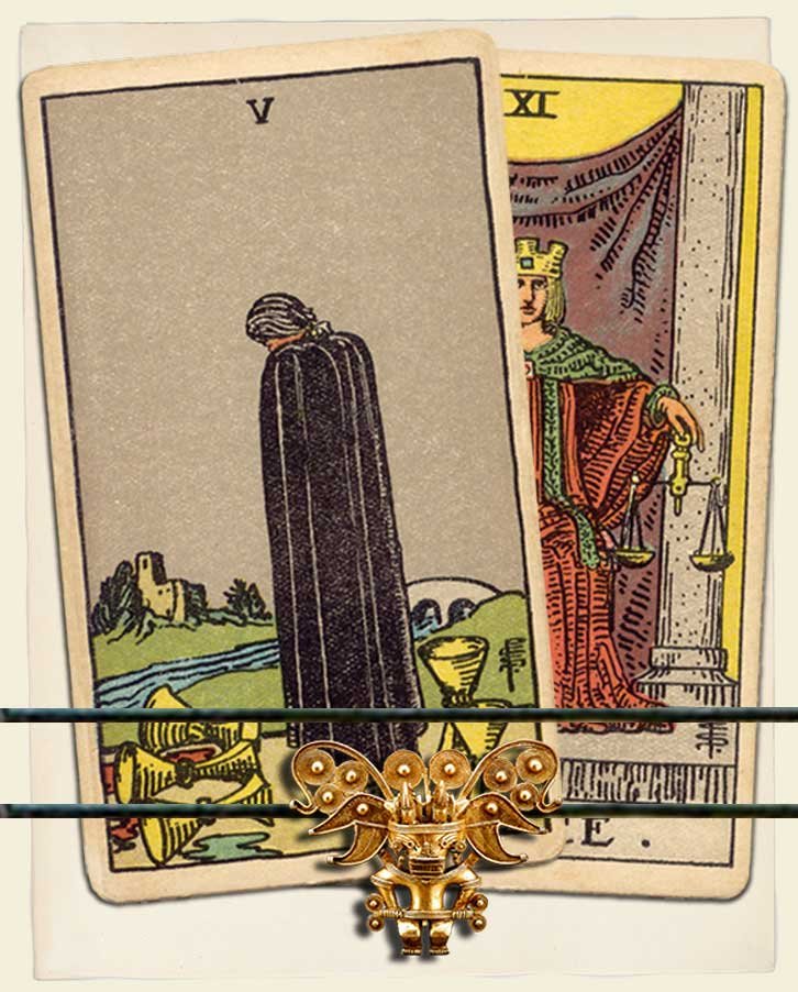 Five of cups and Justice combination gives you a hint about your immediate future. It is influenced by the arcane forces of (A) Regret and (B) Cause And Effect. In other words, this reading implies you will have to take responsibility. Every action has an equal and opposite reaction, as the saying goes. True, you’re not in a good position right now—but guess what? Only one person got you where you are. Still, there’s good news: if you got yourself here, you can get yourself out again. Every action has an equal and opposite reaction, remember?