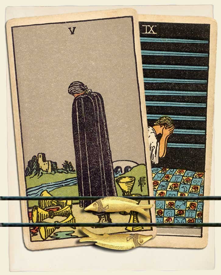 Five of cups and Nine of swords combination means that mystic tarot forces: 1) Pessimism and 2) Anxiety govern your life decisions today when it seems that everywhere you turn you find a disaster, and it is hard to find your objectivity, or even your car. Instead, your nightmares seem more real than your potentials. Your fears are your copilot and now you‘re spinning out for a crash and burn, but wait a minute. Do you smell smoke, or is that steam coming out of your ears from all that furious, self-destructive thinking you have been doing? Slow down, hug a cat, and kick back with a hot chocolate. Restart yourself before it is too late.