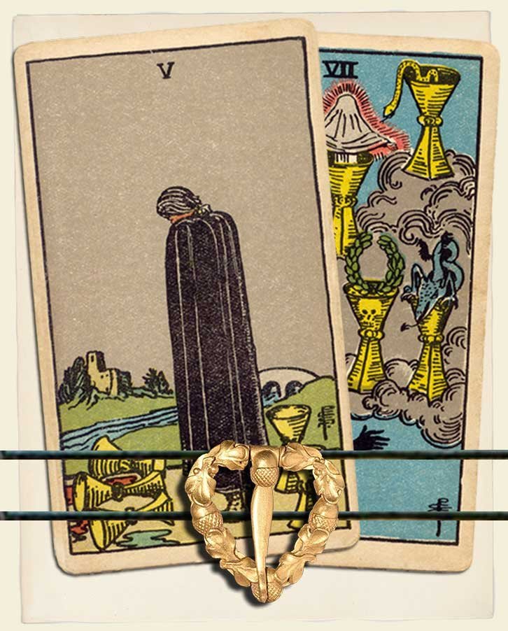 Well, my dear, it seems we have stumbled upon a rather unfortunate combination in the tarot realm. The Five of Cups and Seven of Cups are not exactly what one would call a match made in heaven when it comes to matters of the heart.