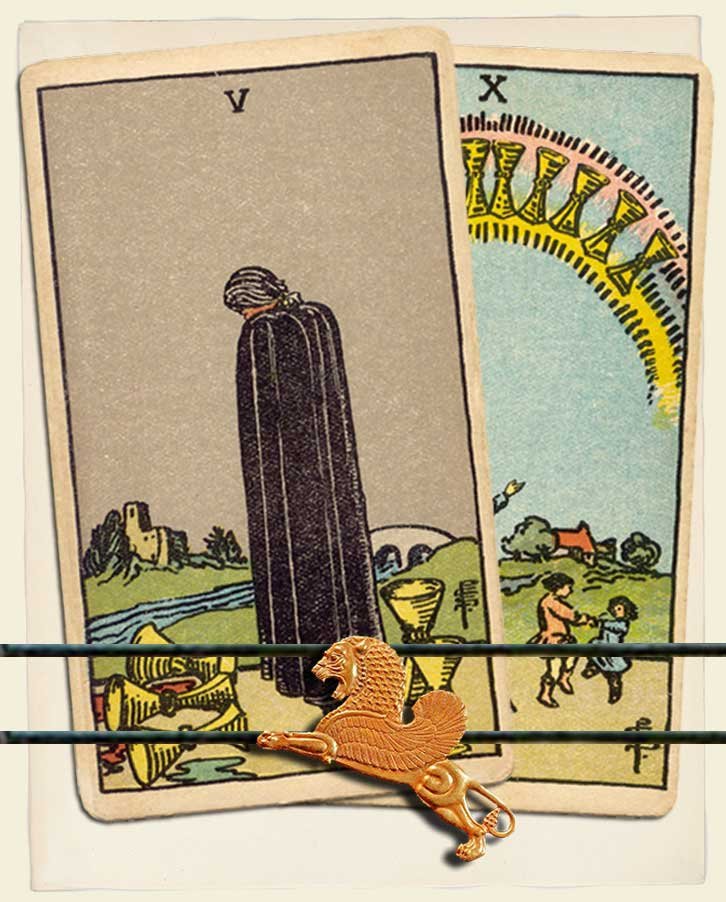 Oh, dear reader, the Five of Cups and Ten of Cups combination is a tricky one when it comes to love and relationships. Let me explain.