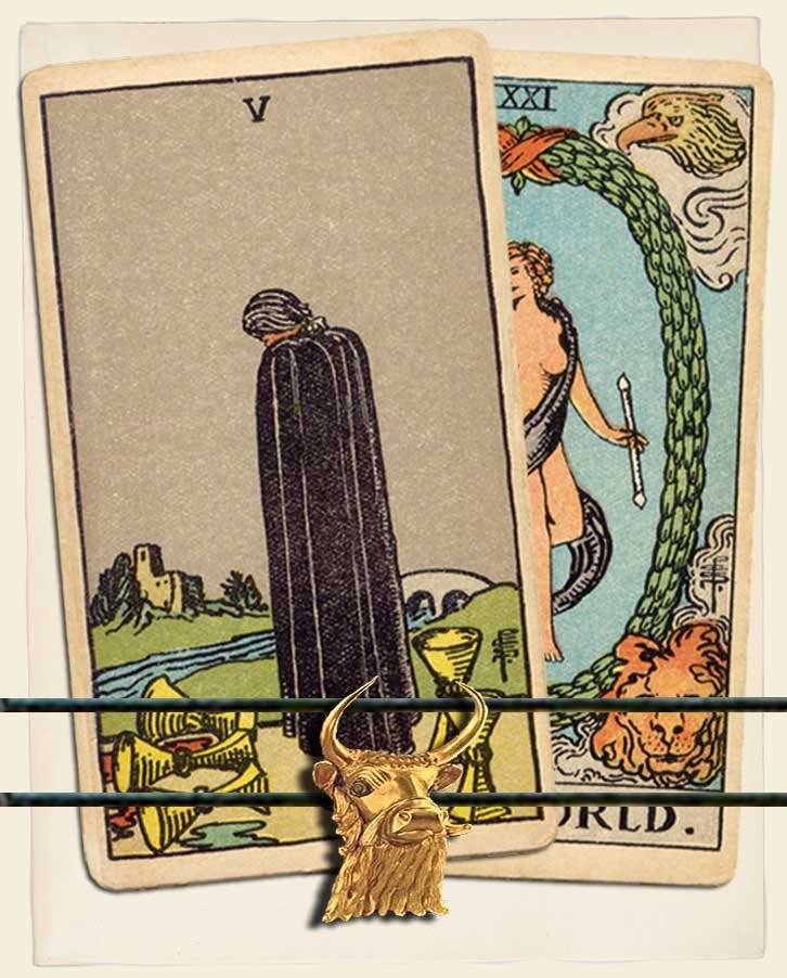 Five of cups and The World tarot combination gives a hint that two tarot influences: 1) Disappointment and 2) Achievement are affecting you today. These energies might sound contradicting, but life tends to offer a bittersweet flavor to experiences at times. If you are grieving a loss or failure, you are being reminded of the strength those circumstances have offered in your growth. It is healthy to feel and acknowledge your disappointments, but don‘t forget to look around you. This painful lesson just might be the last piece of a puzzle that you have been working on for years in your personal growth. You have accomplished more than it feels like you have.
