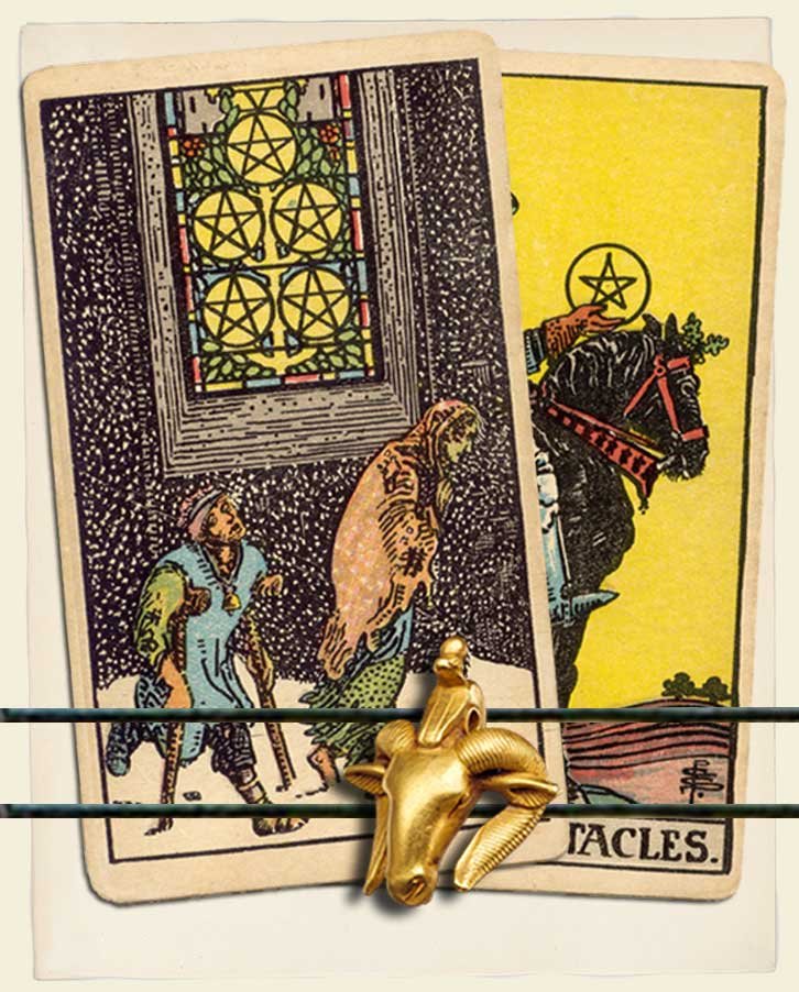Five of Pentacles and Knight of Pentacles combo interpretation