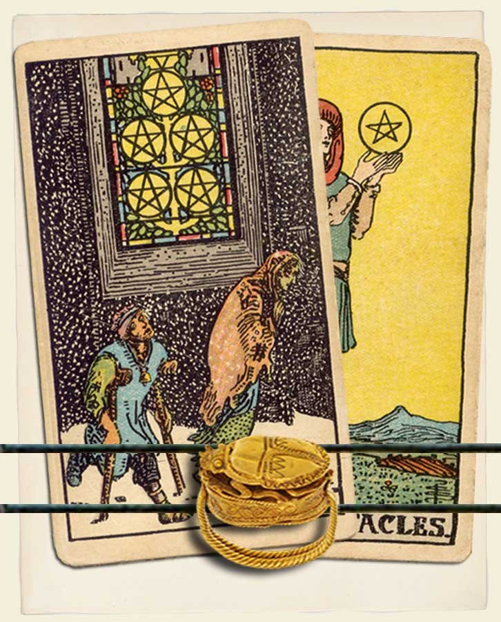 Five of pentacles and Page of pentacles tarot combination means that two tarot influences: I) Worry (Five of pentacles) and II) Planner (Page of pentacles) are influencing you at the moment. Your worries often keep you up late into the night, you find yourself lying awake, overwhelmed with anxiety. During the day, your mind and body are exhausted as a result. This combination encourages you to approach your worries practically, and to take steps towards regaining control. Although some situations will always be beyond your control, putting safety nets in place will at least break your fall, should the worry ever become a reality. Put specific time aside in the day to plan solutions and lay these safety nets out.