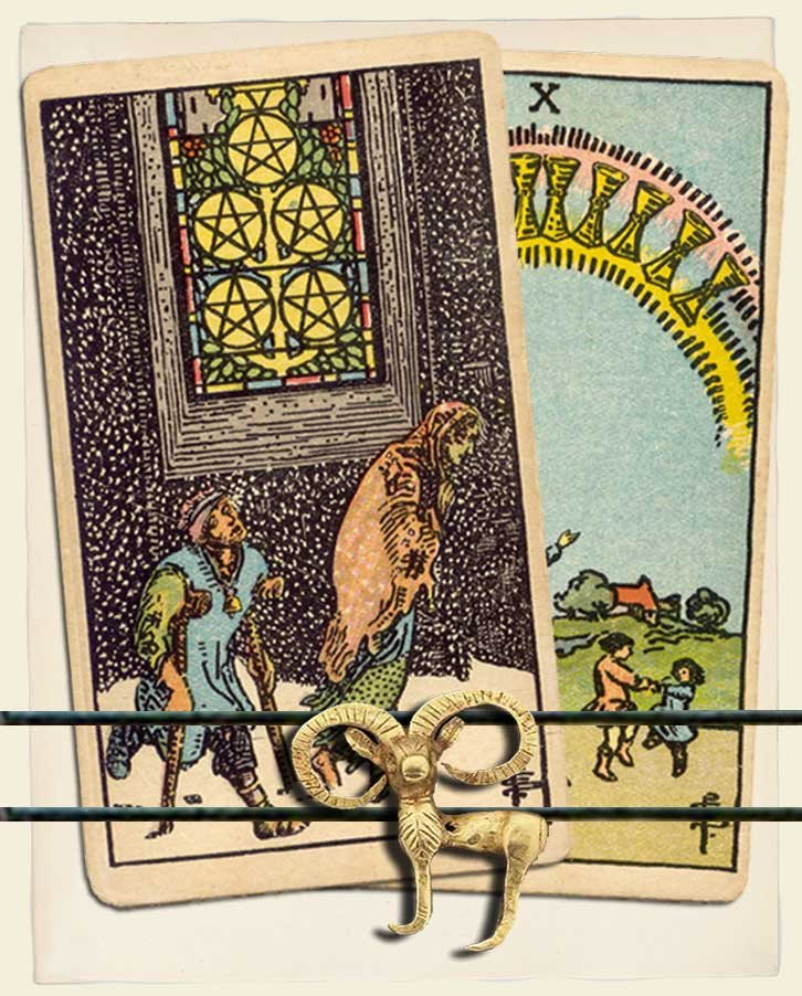 Five of pentacles and Ten of cups tarot combination is an omen that two mystic forces: I) Financial Loss (Five of pentacles) and II) Emotional Stability (Ten of cups) have influence on you at this moment. Now is not the time to fret and spiral deeper in a well of insecurity and fear. Now more than ever is a time for you to persist through these difficult times. Life has challenged you with an earthquake beneath your feet. Are you going to respond by falling into the cracks or using the instability to create stability? Lean on your loved ones. They want you to succeed. Skepticism and pride will only prevent you from working through the next few weeks.