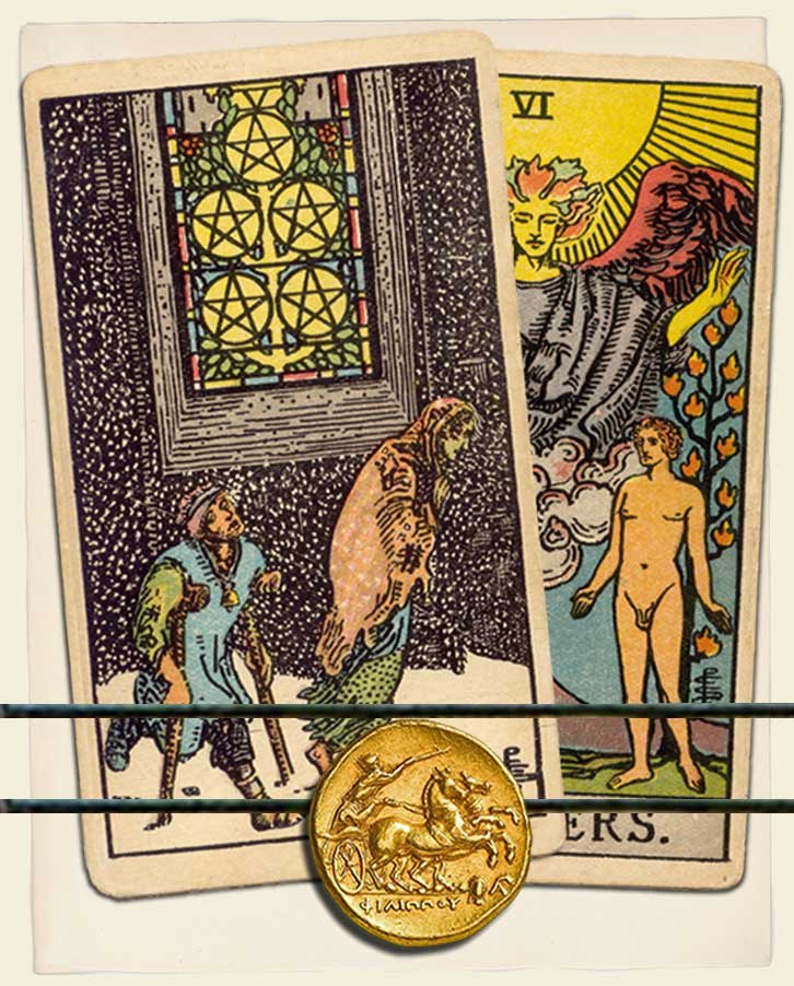 Five of pentacles and The Lovers combination means that arcane tarot forces: 1) Isolation and 2) Values Alignment currently guide your decisions. What’s the advice of this pair? You may be feeling as if you are on an island all by yourself, but don’t worry. This is a good time to take stock of what matters most to you in life. The Five of pentacles indicates that there is something important weighing on your mind that needs addressing. Perhaps it is loneliness or perhaps feelings of being left out, because others have more than enough going for them. Whatever the case may be, now is a good time to evaluate how you feel about certain things in your life and make changes where necessary so you can find greater balance in your relationships.