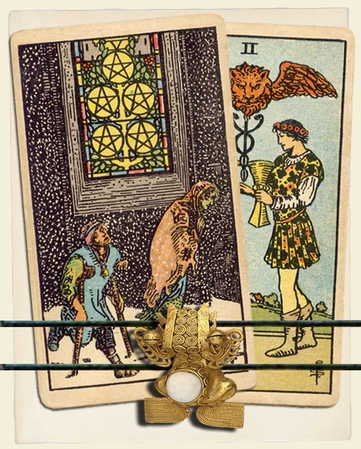 Five of pentacles and Two of cups tarot combination gives a hint about your near future, which will come to pass from the combined effect of (A) FEELING ABANDONED (effect of Five of pentacles) and (B) CONNECTION (effect of Two of cups). How to interpret this in practice? The feeling that you are alone is strong when there is nothing left for you. You may feel as if no one cares anymore, but don’t give up on those closest to you. There is still good in them even if they have lost their way. Reach out and try to understand where they are coming from, because maybe it isn’t too late for you after all.