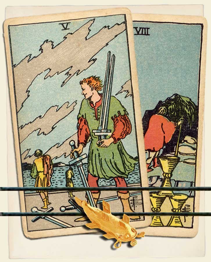 Five of swords and Eight of cups tarot combination gives an insight into a major event in your future, which will arise from the combined effect of: (I) Aggression (effect of Five of swords) and (II) Abandonment (effect of Eight of cups). To put it differently, it indicates that people leave when they think they can’t get anything from you anymore. As you can imagine, it’s a battle of interests. Sometimes you have to give up something, no matter how sad you are. If you leave the things that pull you down, you can rise faster, in summary, it’s time to open your eyes.