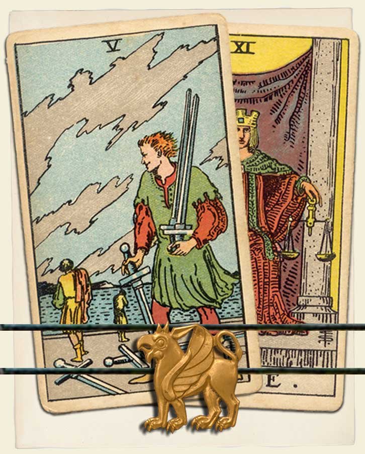 Five of swords and Justice combination gives an insight into an event in your future. It will come to pass from the combined effect of (1) AGGRESSION (effect of Five of swords) and (2) ACCOUNTABILITY (effect of Justice). You will soon be asked to explain why you so fervently disagreed with some family members. You may feel the opposition of some of these family members for a season, but if you explain your motives, they will all come to see and applaud your motivation. Hang in there, all will soon be forgiven.