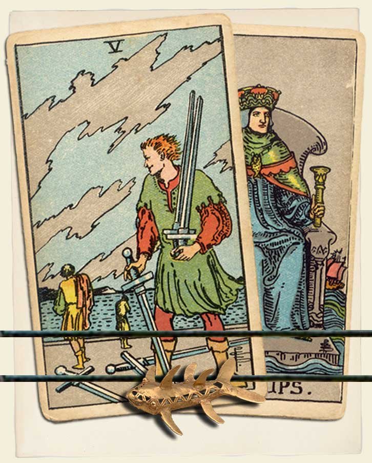 Five of swords and King of cups tarot combination provides an insight into a significant event in your future. It will arise from the combined effect of: (I) DISPUTES (effect of Five of swords) and (II) COUNSELLOR (effect of King of cups). To put it differently, it gives you a sign to take a diplomatic approach to resolving any conflict you may be involved in. What’s the advice of this pair? The Five of swords indicates that there is an intense dispute in your life. This card carries a “win at all cost” energy that can be very destructive. The King of cups is a diplomatic energy that can calm matters down. This card is a reminder that negotiation is an option, and there is a fair way to settle things. There’s no need to “destroy” anyone to achieve total victory.