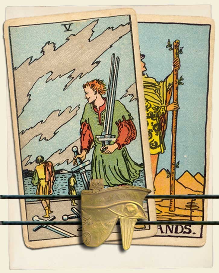 Five of swords and Page of wands combo gives a glimpse into your near future. It is influenced by the arcane forces of (A) AGGRESSION and (B) FREE SPIRIT. In essence, you may encounter conflict soon. Your care-free attitude is not for everyone, as you well know: you drift through the world with a lightness many envy. Well, imminently, someone will attack, these cards say. Still, you have little to fear–they won’t be able to grab a hold of you. Trust yourself: Allow yourself to be carried to safety by the breeze you know so well.