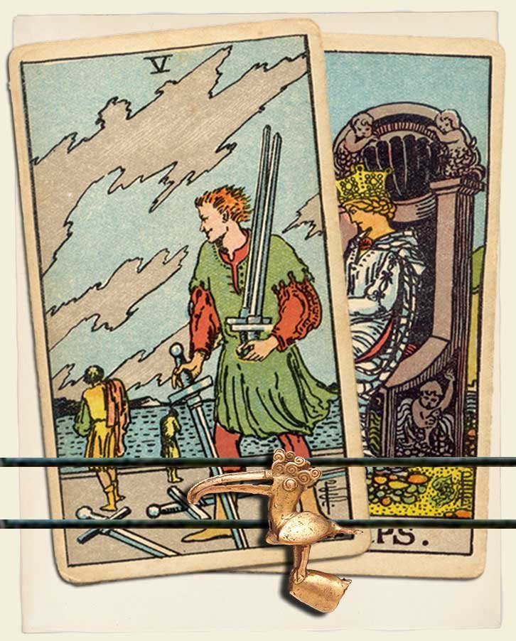 Oh my, Five of Swords and Queen of Cups together in a love reading can be quite tricky to decipher. It seems like there are two mystic forces at play – bullying and supportive energy from the Queen of Cups. This combination usually indicates emotions and intuition taking over.