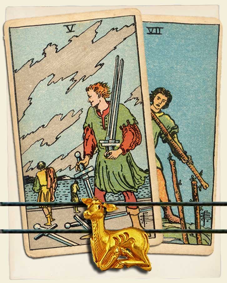 Five of swords and Seven of wands combination indicates that two forces: 1) DISAGREEMENTS and 2) PROTECTION drive your choices at this moment. A contrast with someone or something is about to happen: this is not the right time to fight, rather take shelter and try not to lose energies or resources over it. The savvy warrior chooses wisely his own fights, and never seeks victory where there can be none. Better times will eventually come.