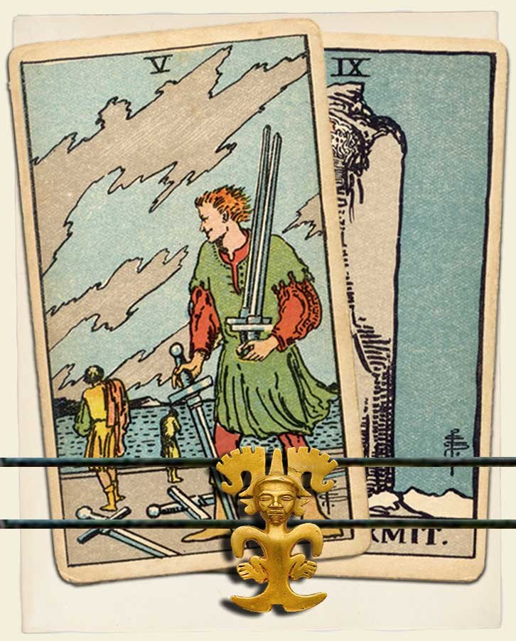 Five of swords and The Hermit combination is a sign that two tarot influences: 1) Arguments and 2) Being Alone drive your choices at this moment. What’s the advice of this pair? You may be going through a rough time in your life, but it seems like you are holding on to things too tightly. The Five of Swords indicates there is conflict around you, perhaps even verbal arguments or fights. This can create an energy of isolation that makes people feel as if they are alone in the world. It also creates self-pity and feelings of defeatism. If you’re feeling down about something, take advantage of having The Hermit with us today to remind yourself that no matter what happens in life, you have control over how you respond to it.