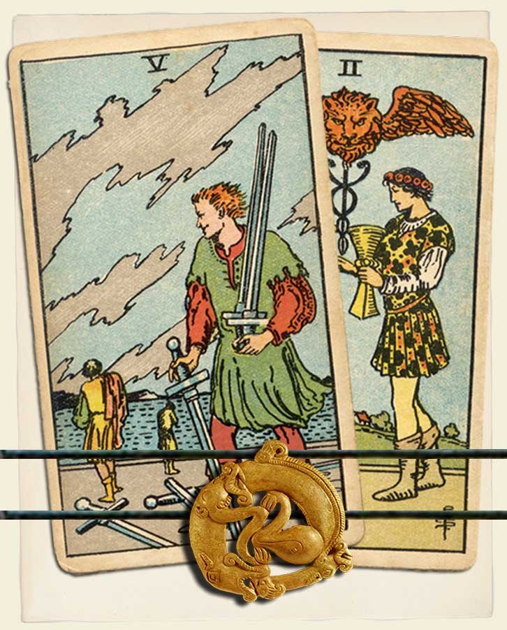 Five of swords and Two of cups tarot combination gives you a hint about your immediate future. It will arise from the combined effect of: (I) Disagreements (effect of Five of swords) and (II) Connection (arcane effect of Two of cups). What does it mean in practice? This is an energy that can be hard to find when there are conflicts between people you care about, but with the Five of Swords present, these disputes may not go away easily. The situation won’t necessarily get worse or even stay the same, but it could take longer than usual for things to settle down. That said, if you have been avoiding conflict because you don’t want this bad luck to follow you around like a curse, now is probably not the time to start bringing up unpleasant subjects again. Let sleeping dogs lie for a while.