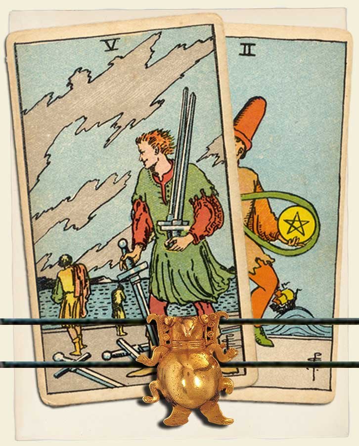 What’s the meaning of Five of swords and Two of pentacles for love and relationships?