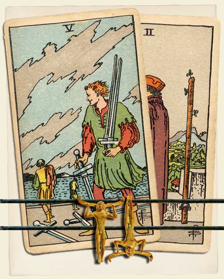 Five of swords and Two of wands tarot combination gives you a better insight into your immediate future. It will take place as a result of (1) WINNING AT ALL COSTS (effect of Five of swords) and (2) DECISIONS (effect of Two of wands). How to interpret this tarot combination in practice? In other words, you will face an ethical dilemma. How long have you been chasing this particular carrot now? True enough, you’ve put in the work and probably deserve at least a modest bite– but don’t be too hasty, these cards suggest. An opportunity for reward will present itself soon–but it will come at another’s expense. The question is, which is more important to you, your integrity or your appetite?