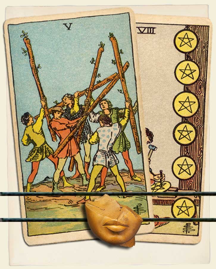 Five of wands and Eight of pentacles tarot combination indicates that arcane tarot forces: A) COMPETITION (Five of wands) and B) CRAFTSMANSHIP (Eight of pentacles) are affecting you today. What’s the advice of this pair? The Five of wands indicates that there may be arguments and disagreement around you. They are likely about petty matters, but they’re still causing unwanted distractions. The Eight of pentacles indicates that you would like to focus on your work or another time-consuming project that’s important to you. You’re having some luck tuning out the distractions, but that won’t eliminate the problem. Don’t derail your work, but take enough time to confront whatever issues may be causing the disruptions, and put them to bed, so you can get back to focusing on achieving your goals.