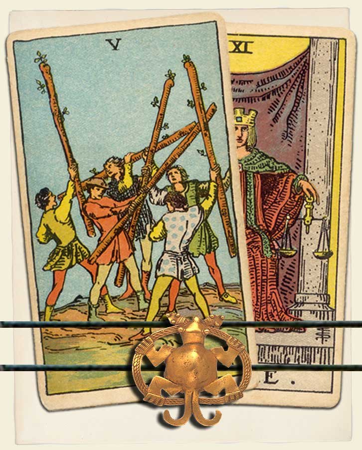 Five of wands and Justice combination provides an insight into a situation in your future, which will come to pass from the combined effect of (1) Conflict (effect of Five of wands) and (2) Law (effect of Justice). In essence, trouble is on the horizon. When you run up against authority, it’s as inevitable as fire on hot, dry day. But, these cards suggest, at least knowing this, you can prepare and avoid the worst. Crazier still, why not use your hard-won experience and give yourself the opportunity to walk away completely? There is already so much fighting in the world, after all.
