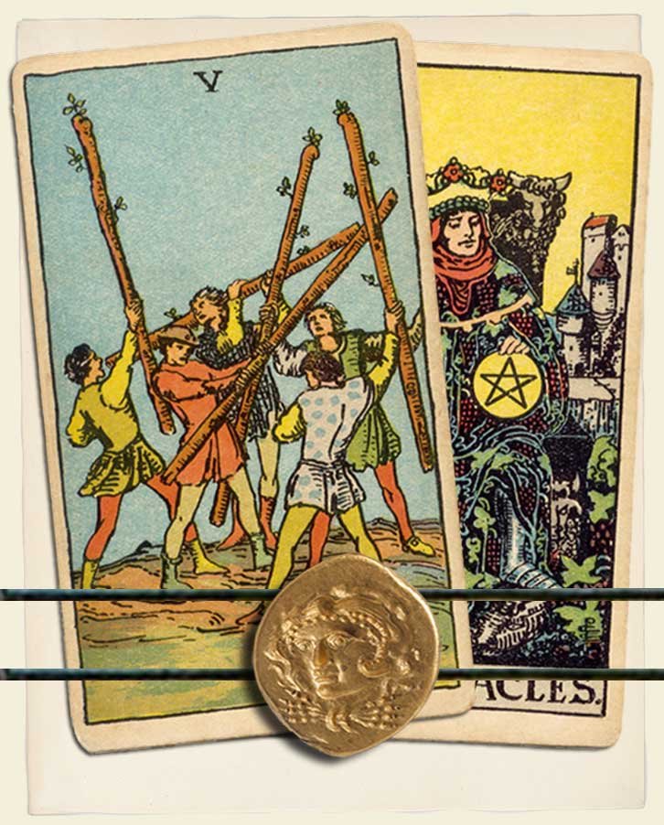 Five of wands and King of pentacles combination means that tarot influences: 1) Competition (from the side of Five of wands) and 2) Security (from the side of King of pentacles) govern your life decisions today. In essence, you are in a position to defend what is yours. What’s the advice of this pair? The Five of wands represents conflict or competition – usually from people who want something you have. This card indicates that there may be some kind of battle going on around you, but it isn’t necessarily about material gain. The King of pentacles represents abundance and security. You have something valuable to protect, so don’t let anyone take advantage or try to steal it from you.